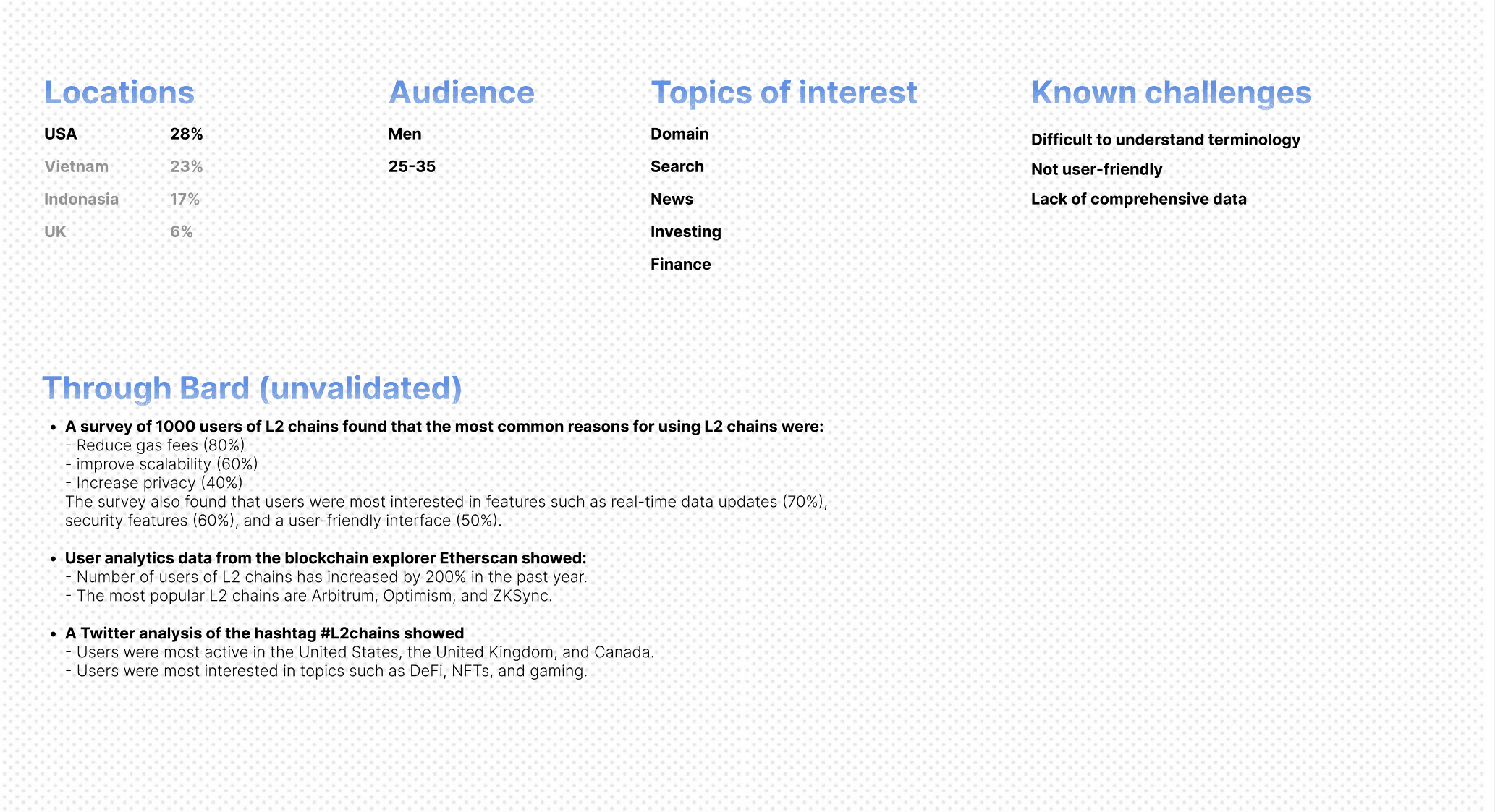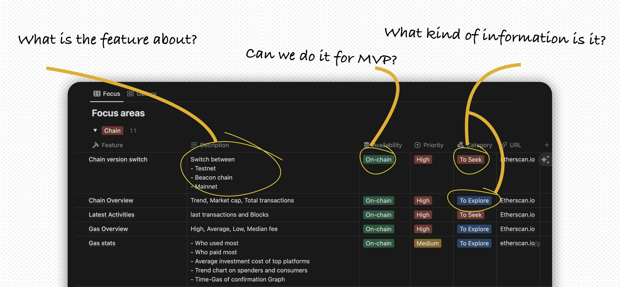 We created feature map for blockscout and ether scan to compare how they function and found 2 key categories or users and Features